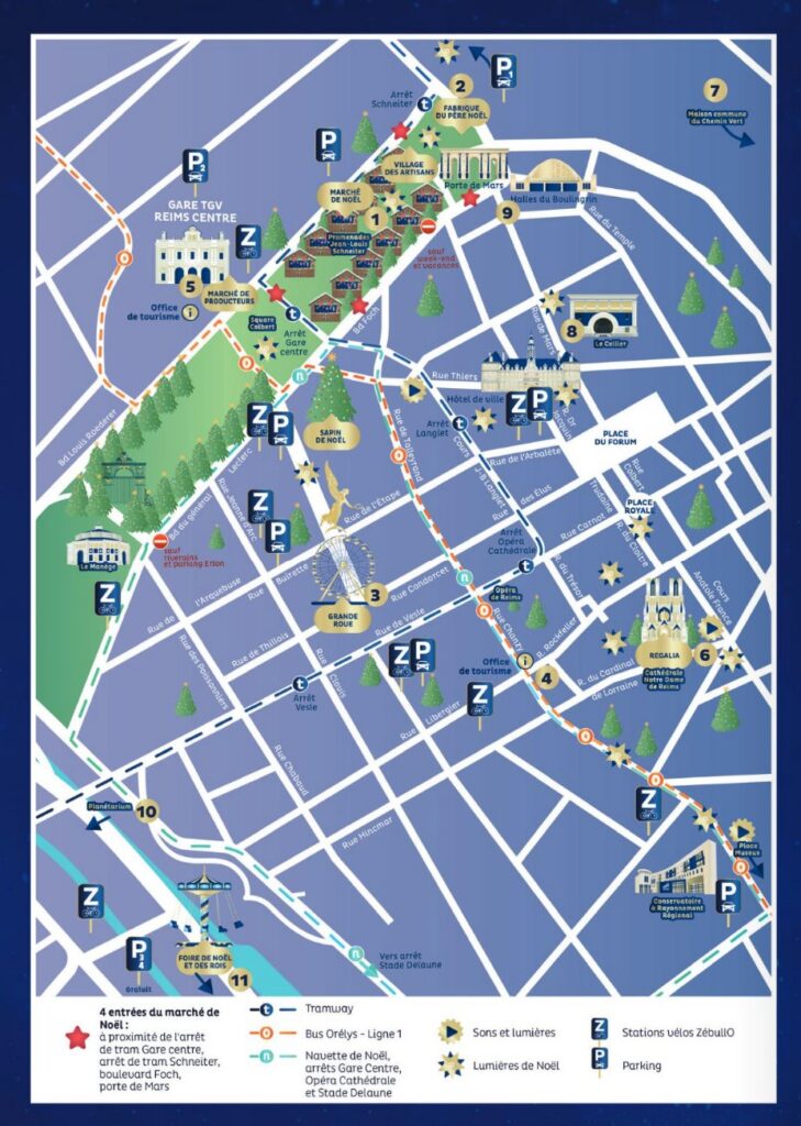 Het parkeren voor de kerstmarkt is goed geregeld in Reims. Volg de borden Reims Centre en dan zie je al snel borden met P1, P2 of P3 Marché de Noël. Wel betaald, maar op prima loopafstand van het deel met alle kramen. Reims ligt op een 30 km van Epernay en is dus goed te doen als dagtrip vanuit Epernay of Cramant.